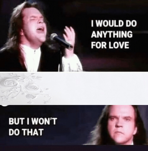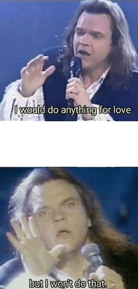Meat Loaf - I'd do Anything for love - Grand Gala du Disc - 27 september 1993 (Dutch tv show), This is The Dutch TV premiere of "I would do anything for love" of the singer Meat Loaf. He sang it on his Birthday september 27th . We Have got 15 images about Meatloaf Anything For Love Meme images, photos, pictures, backgrounds, and more. In such page, we additionally have number of images out there. Such as png, jpg, animated gifs, pic art, symbol, blackandwhite, images, etc. "Anything for love ...", In February 2014, one of Gerdi McKenna's friends wrote an email requesting a photoshoot for all her friends as she was . "First Time Hearing , ROAD TO 420000 SUBSCRIPTIONS *** to Donate using Paypal!: https://www.paypal.com/paypalme/Mrlboydreacts Patreon ..